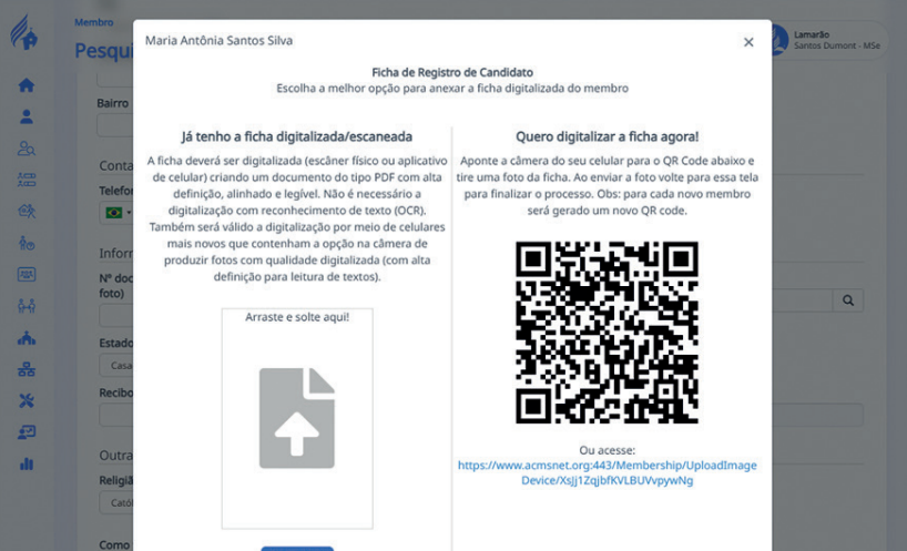 Além da inserção dos dados, é necessário digitalizar a ficha, caso esteja impressa, e anexar o arquivo correspondente no registro do novo membro no ACMS. O Guia para Secretaria traz informações sobre como digitalizar e anexar a ficha. Em caso de fichas digitais, será preciso apenas anexar o arquivo.