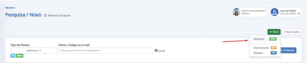 Para cadastrar um novo membro, que ingressou por batismo, rebatismo ou profissão de fé, você deve ter em mãos a ficha de Registro do Candidato. Acesse o ACMS em “Membro”, “Pesquisa/Novo” e clique em +Novo membro . Escreva o nome do membro e pesquise.