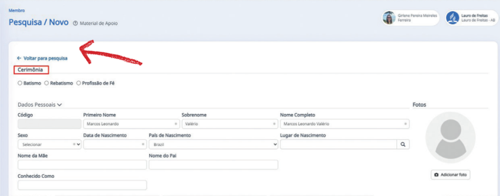 ATENÇÃO: Em todo caso de Rebatismo, precisamos tentar encontrar o cadastro antigo deste membro. Se não encontrar, peça ajuda da secretaria da Associação.
