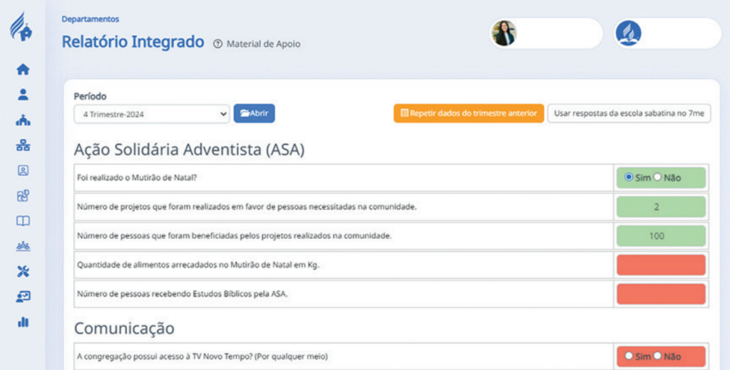 Agora é possível utilizar os apontamentos da Escola Sabatina feitos no 7me, para o preenchimento do relatório integrado, caso deseje inserir as informações, clique em “Usar respostas da escola sabatina no 7me”.