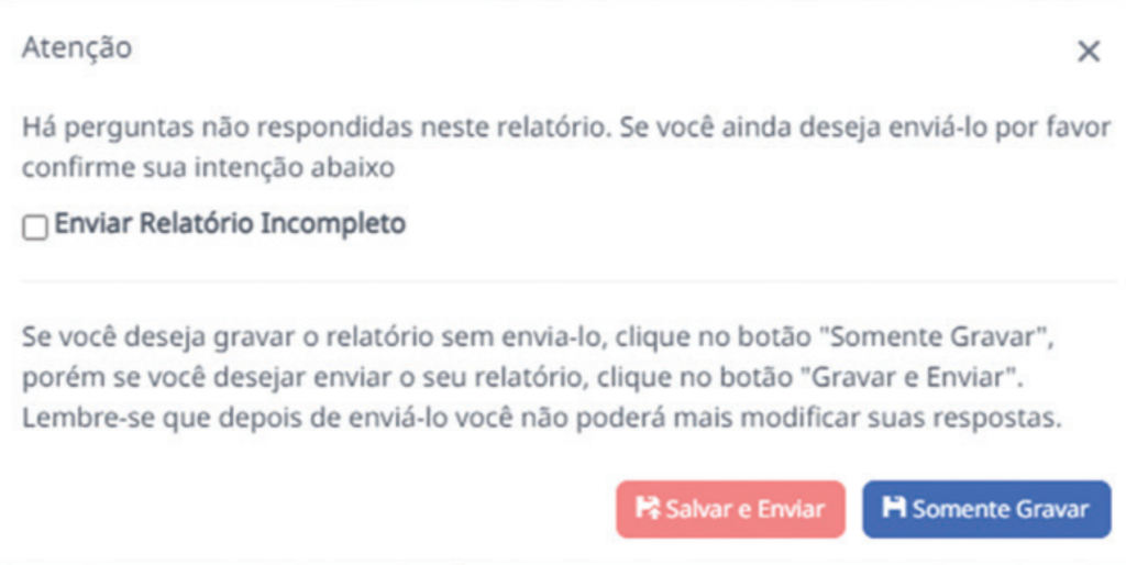Se clicar em “Salvar e enviar” o relatório segue para a Associação/Missão e só poderá ser editado com a liberação do campo dentro do período de preenchimento. Caso clique “Somento gravar” as informações / dados ficam registrados localmente, sendo possível a edição a qualquer momento dentro da data limite de preenchimento.