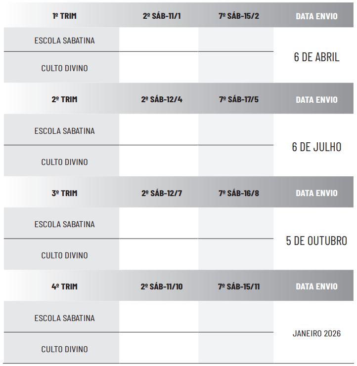 A primeira comissão diretiva que acontecer após o fechamento do Relatório Integrado trimestral deverá avaliar objetivamente as ações de cada ministério ou departamento, louvando a Deus pelos progressos e planejando ajustes no que poderia ser melhor.